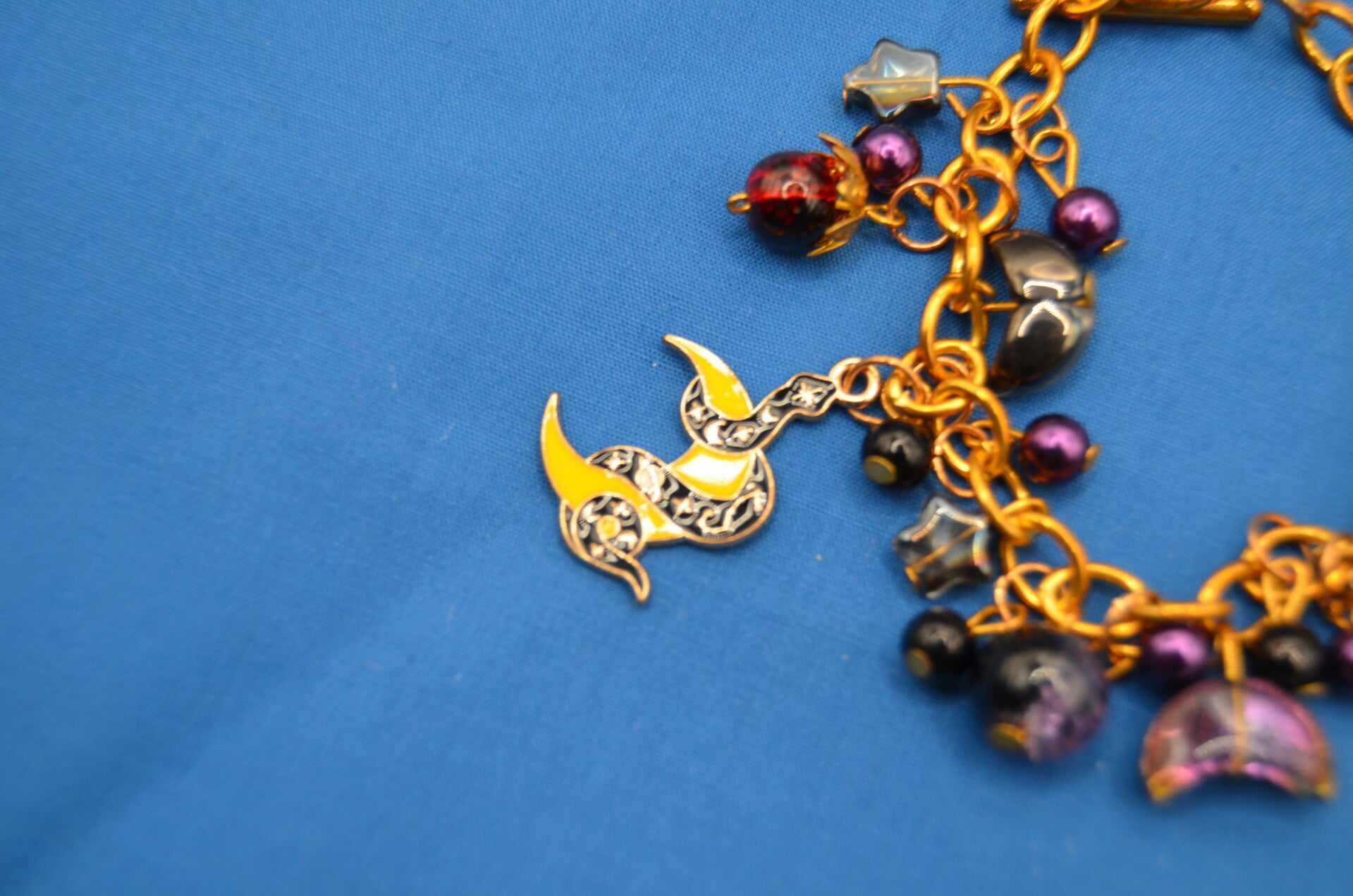 beauilful charm bracelet with moons, snakes,and stars charms.